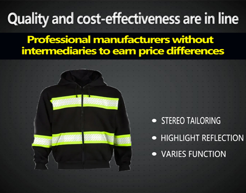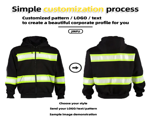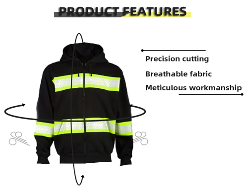 Through the eye-catching fluorescent yellow reflective strip design, the visibility of the wearer is greatly improved in low light conditions (such as night, early morning, evening) or complex environments, providing protection for travel safety. It is suitable for scenarios such as “travel safety guards”, such as road construction workers, cyclists, outdoor workers, etc. It can effectively reduce the risk of being ignored by vehicles and other groups. Adopting a hooded zipper style, it combines practicality and warmth. The black body is paired with a fluorescent yellow reflective strip, ensuring both safety warning effect and daily wear compatibility.