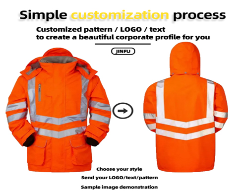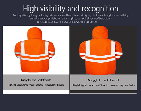 This is a reflective safety work clothes cotton jacket, featuring a striking orange main color tone and multiple reflective strips. It can effectively reflect light under illumination, greatly improving the visibility of the wearer in road construction, municipal operations, road rescue and other scenes, ensuring work safety.