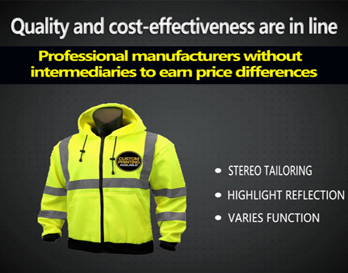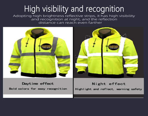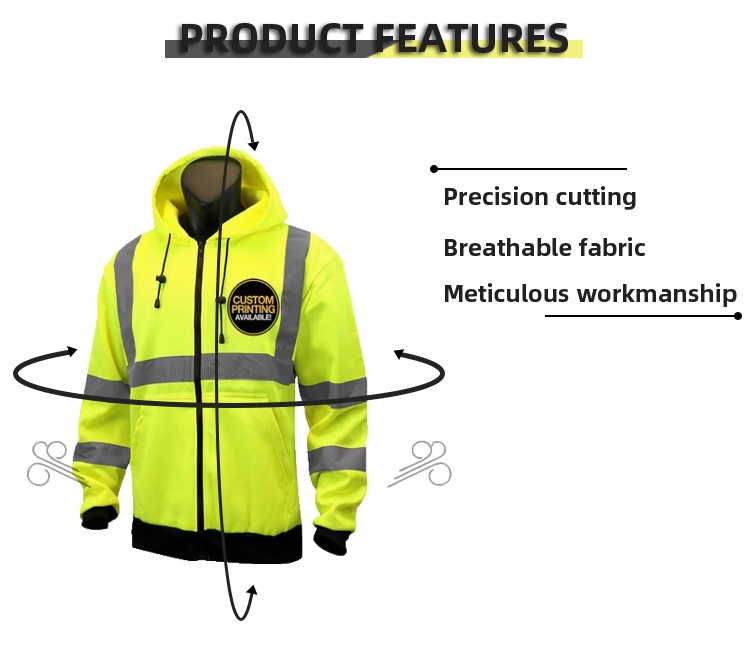 Functional attributes: The garment is designed with reflective strips, with fluorescent yellow as the main color and reflective elements, providing high visibility and suitable for outdoor operations, construction projects, traffic command and other safety warning scenarios; The hooded style also enhances protection and practicality.